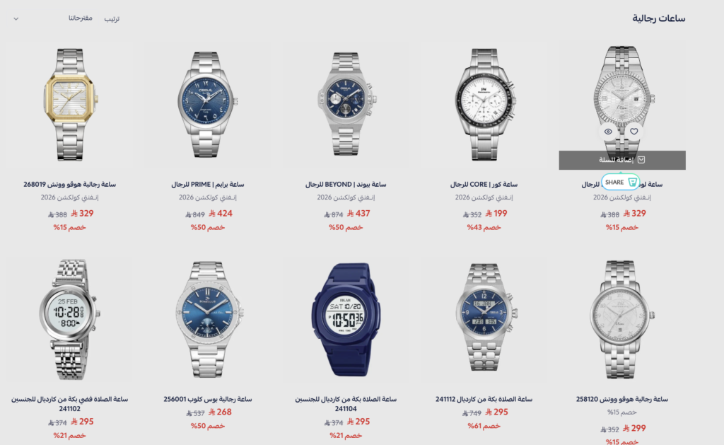 2. تصفح الأقسام (ساعات رجالية، ساعات نسائية، ساعات ألماس، ماركات عالمية).